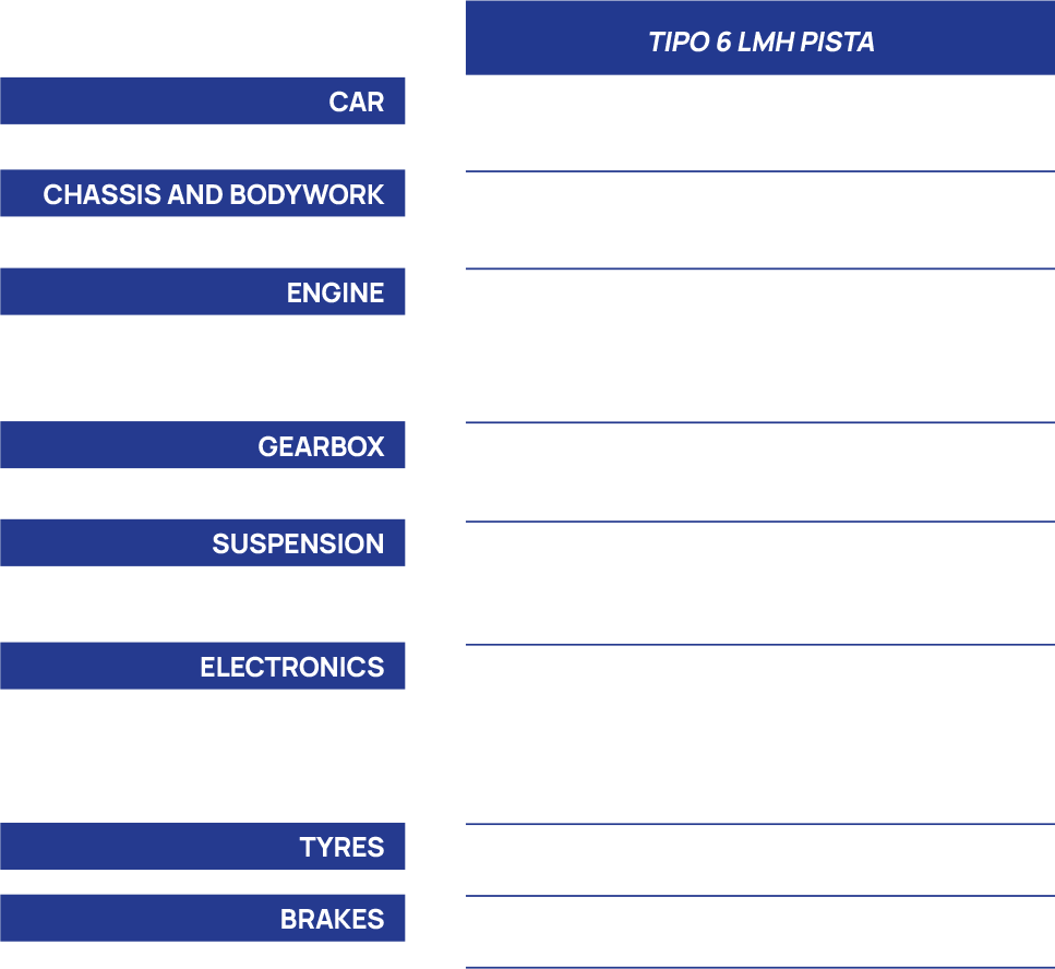 The Tipo 6 Pista has no BOP (Balance of Performance) limitation due to FIA-ACO regulations. An extreme car for great driving enjoyment, dedicated to gentlemen drivers who are looking for “the absolute”, but with safety standards that comply with the highest standards required by current regulations.
